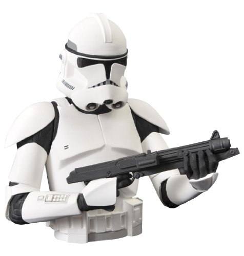 This Star Wars bust bank features the cloned forces of the Republic- the unstoppable Clone Troopers! Measuring over 8-inches tall and fully armed to blast would-be thieves, each bank's durable construction and light-weight design combine to create an economical top-quality display piece perfect for any